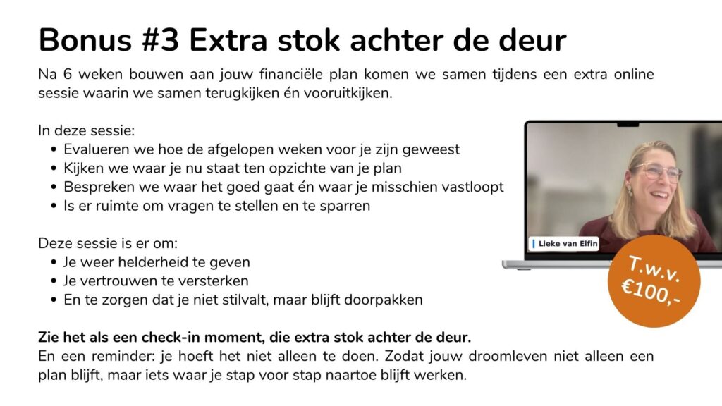 Dat is precies waarom het maken van je financieel plan onderdeel is van het jaarmembership. Je staat er niet na zes weken alleen voor. Je blijft onderdeel van de Community, krijgt begeleiding en kunt blijven terugvallen op ons, de financiële expert en de structuur die we je bieden.